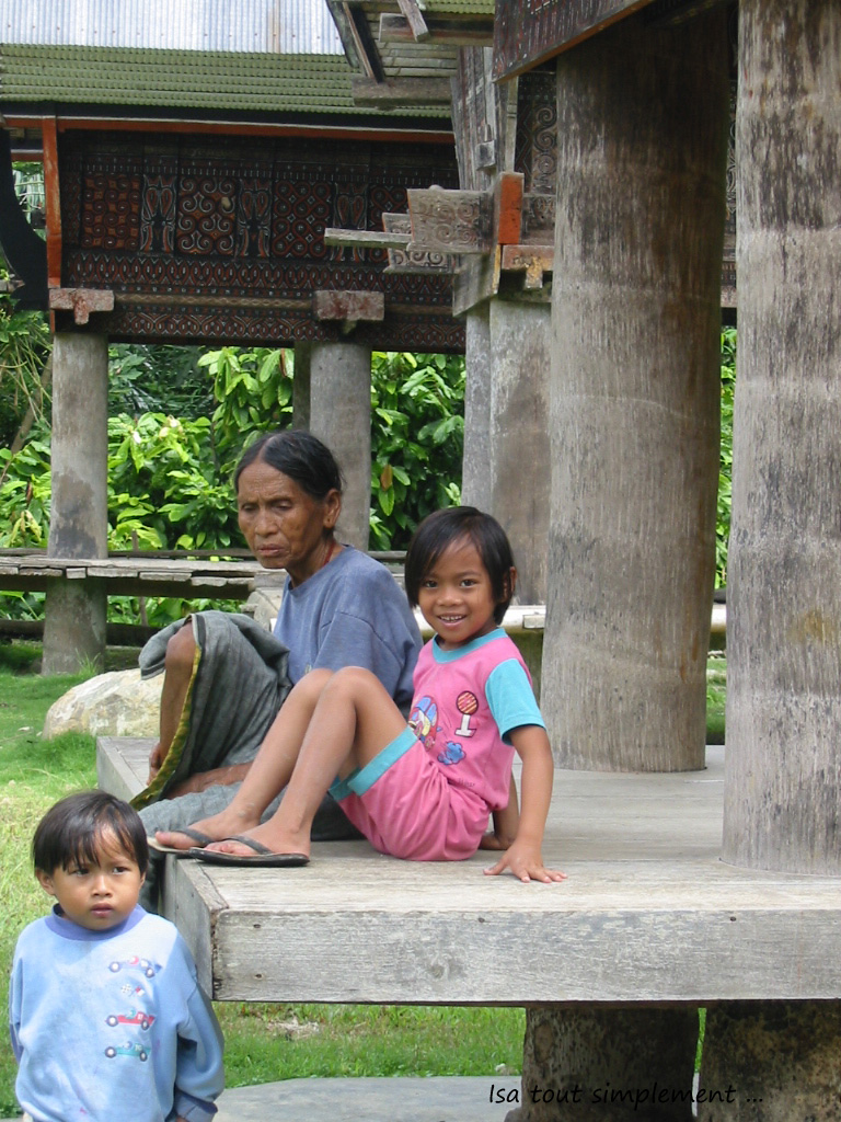 En pays Toraja , un frère et une sœur en train de jouer sous un grenier à riz,