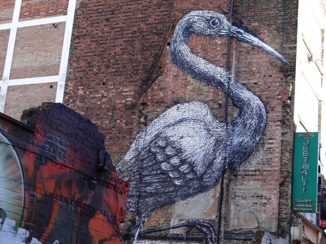 Beaucoup de ces oeuvres sont issues de Brick Lane , quartier mondialement connu pour ses graffitis et notamment ceux de Banksy ou de ROA qui a peint le héron ci dessous.