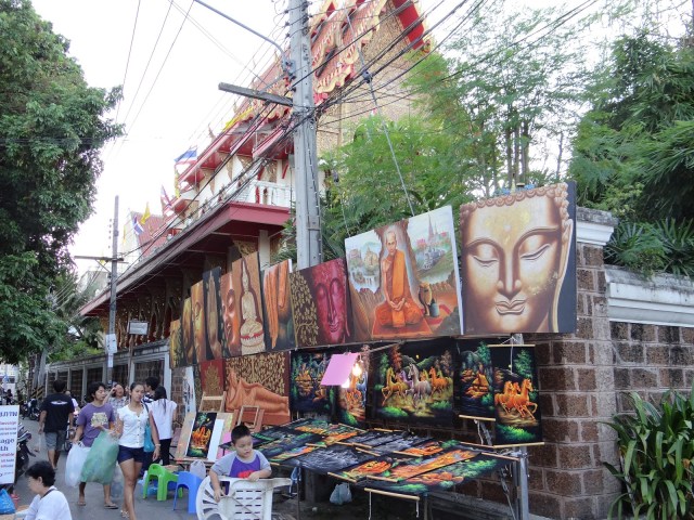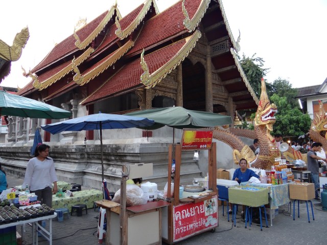 Ce dernier se tient dans la rue principale de la vieille ville , Radchadamnoen Road , les étals sont installés dans cette rue et rues adjacentes mais également dans les cours et jardins des temples , cela apporte un charme supplémentaire à l’ensemble …
