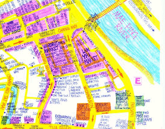 Emplacement des marchésSunday Evening Market dans la vieille ville sur la rue principale Radchamanoen Road et dans les rues adjacentes, Warorot Market et Lam Yai tous les jours  au nord ouest de la vieille ville, au bord de la rivière, marché au fleurs juste à côté du Lam Yai Market du côté de la rue qui longe le fleuve, Night Bazar Market tous les soirs à partir de 19h autour de Chang Khlang Road au Nord Est de la vieille ville.
