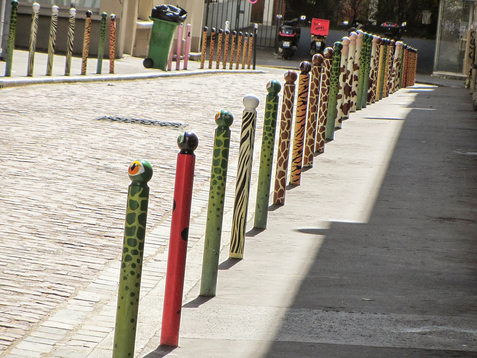 Cet artiste urbain s’est amusé à poser son œil coloré et son âme empreinte d’humour et de poésie sur le mobilier urbain en repeignant les 93 poteaux de cette petite rue en zèbre, crocodiles, girafes, léopards, grenouilles pour le bonheur des riverains.