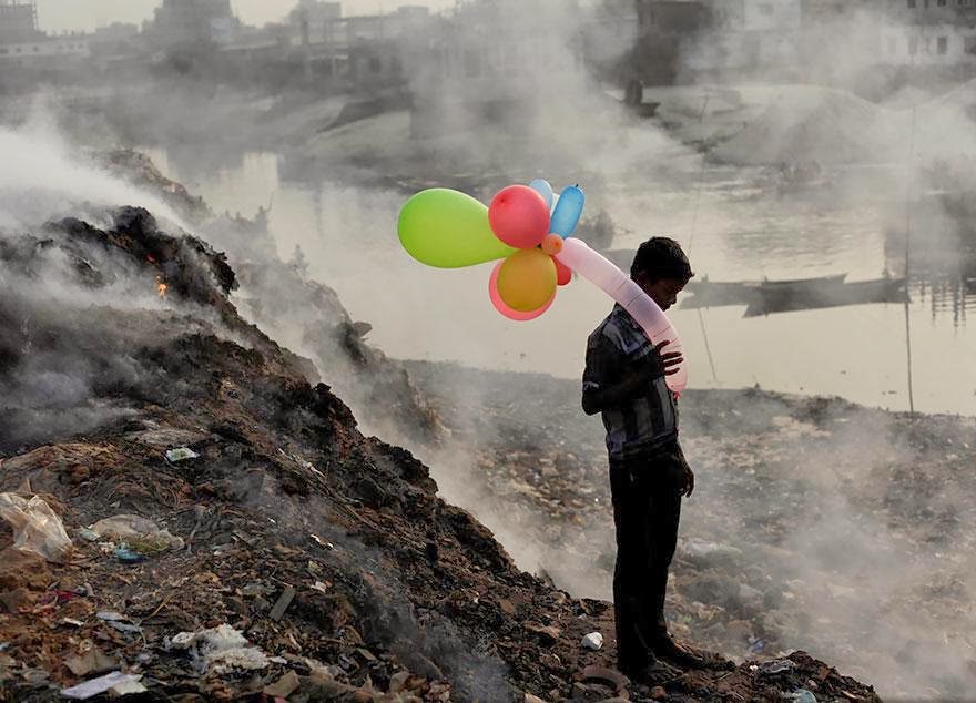 Où cet enfant jouant avec des ballons multicolores juste à côté d’une riviére polluée au Bangladesh,