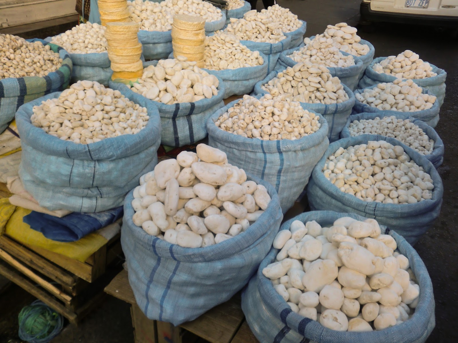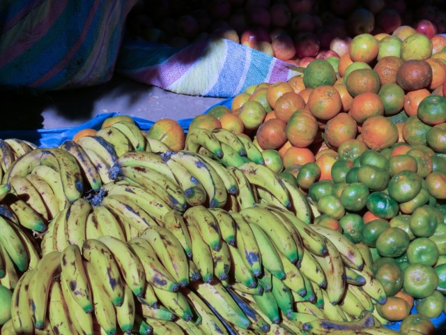Les étals sont posés sur des bâches directement sur le bitume et proposent d’énormes avocats, des pommes de terre de toutes les couleurs et formes et d’excellents fruits de la passion.