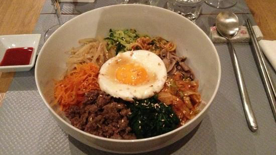 Bibimbap au tartare de bœuf, Bibim Mandu ou raviolis frits servis avec une salade pimentée choux/carottes à accompagner avec un thé gourmand, j’adore cette petite pause zen et exotique au milieu de l’agitation du samedi ou en pleine fureur de la soirée qui envahit généralement le quartier.