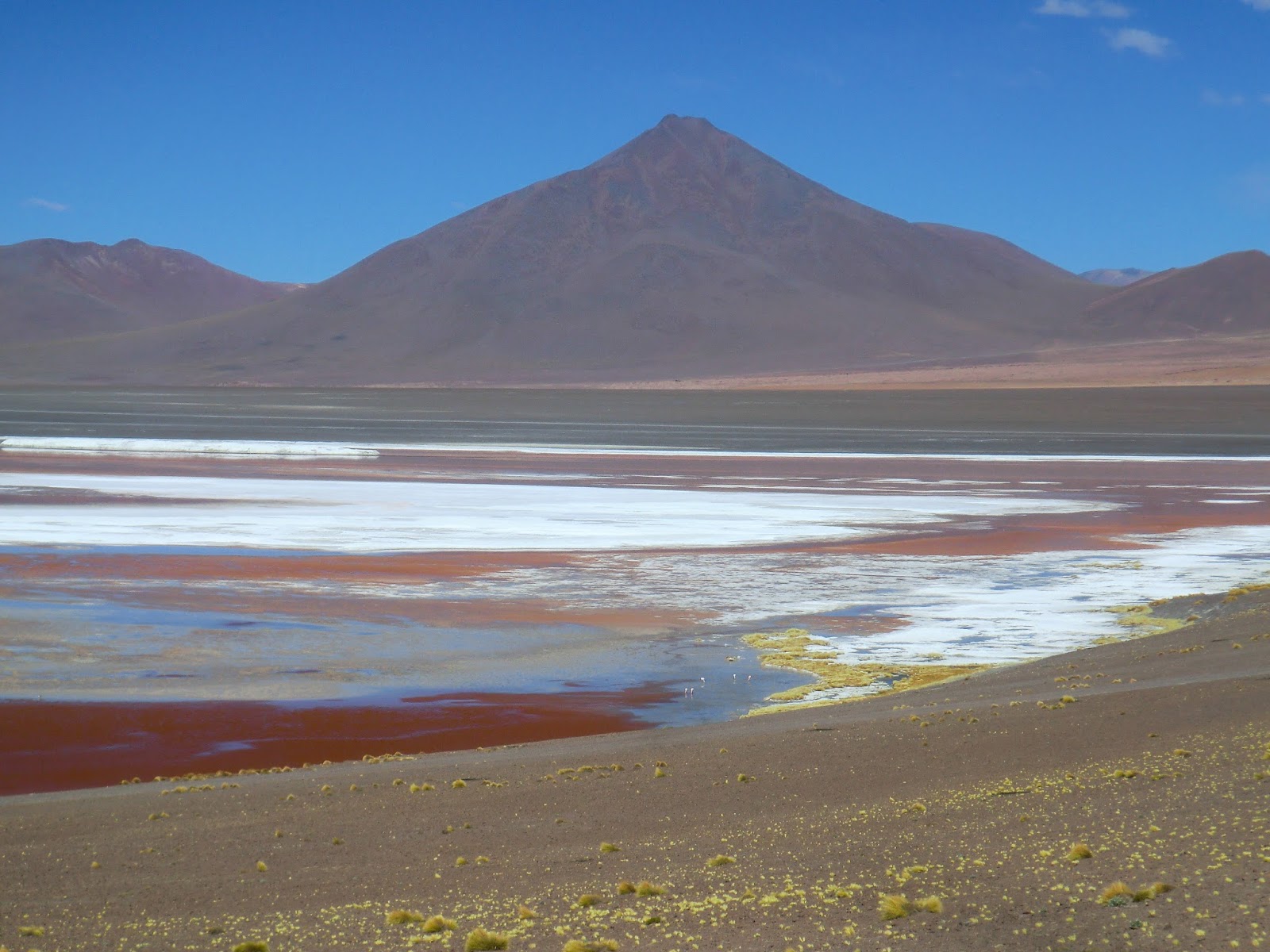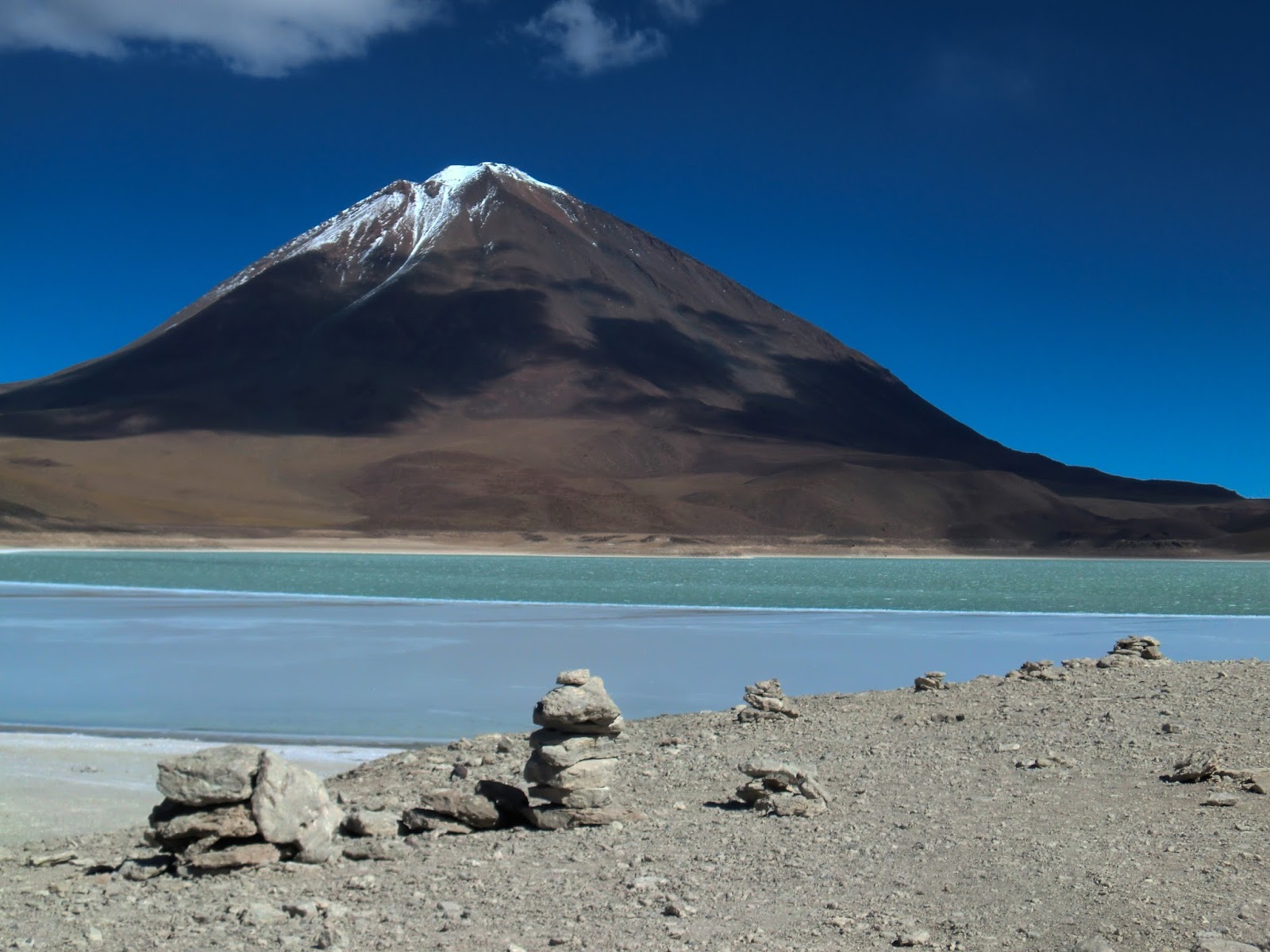Pour terminer, tout au bout de la route , côte à côte, la laguna blanca et la laguna verde avec juste au-dessus le volcan du Licancabur qui semble, tel un dieu tout puissant, veiller au calme des lieux.