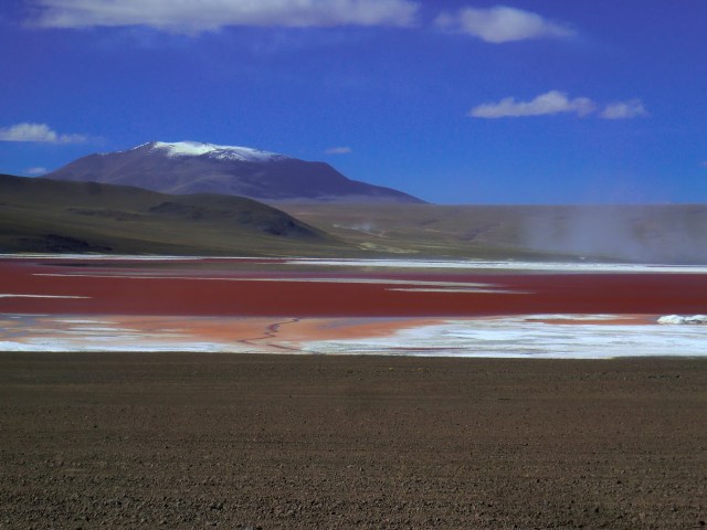 Perchée à presque 5 000 mètres d’altitude, cette lagune est un lieu magique et ce sont les algues présentes dans son eau qui lui donnent un aspect rouge sang, couleur qui au plus fort de la journée tranche avec le bleu du ciel et le blanc des dépôts de sel sur les berges.