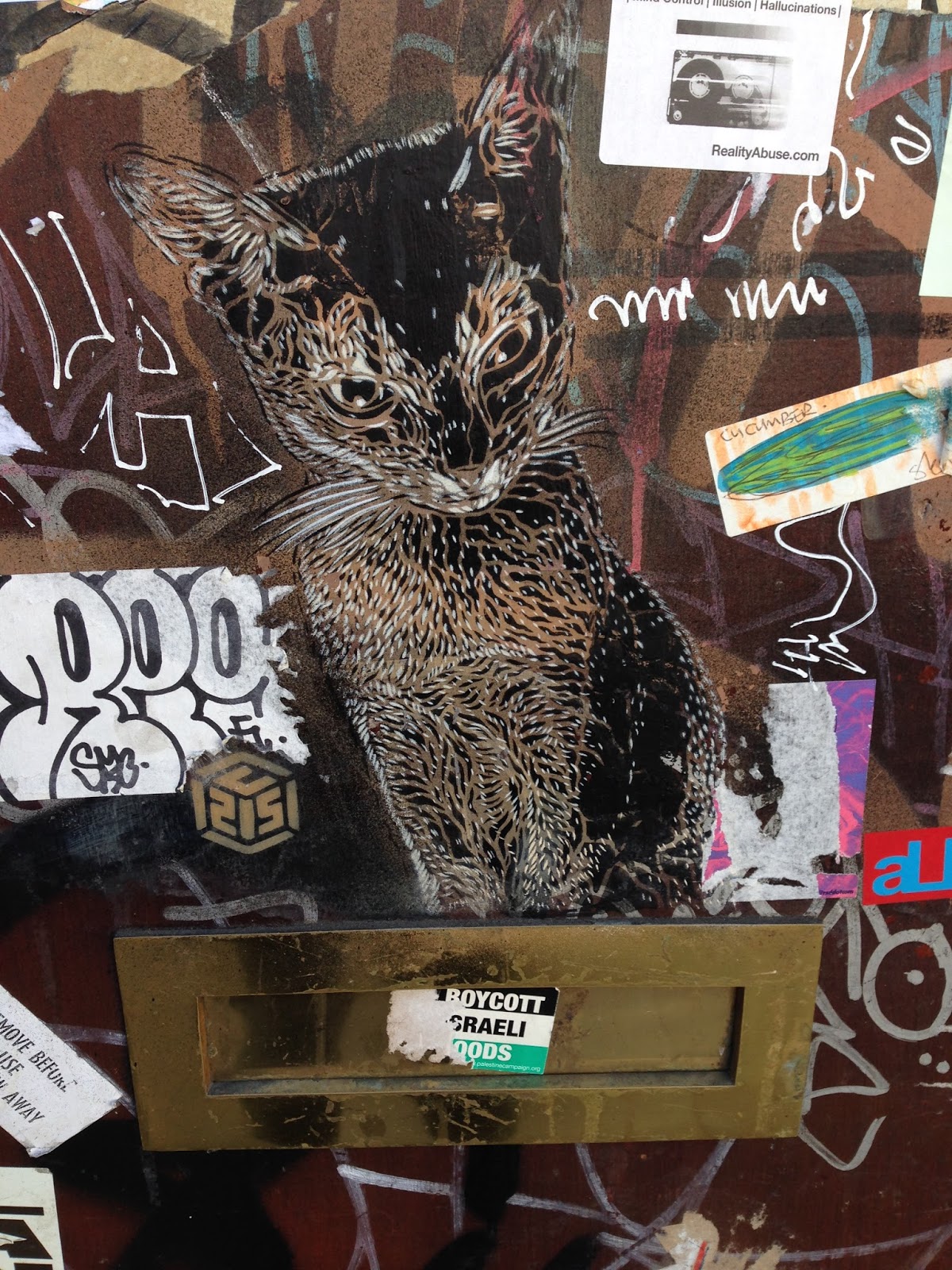 Idem pour le chaton de C215 sur Bethnal Green qui semble sortir de la boite aux lettres, à l’affut, prêt à sauter sur la souris qui oserait passer par là…