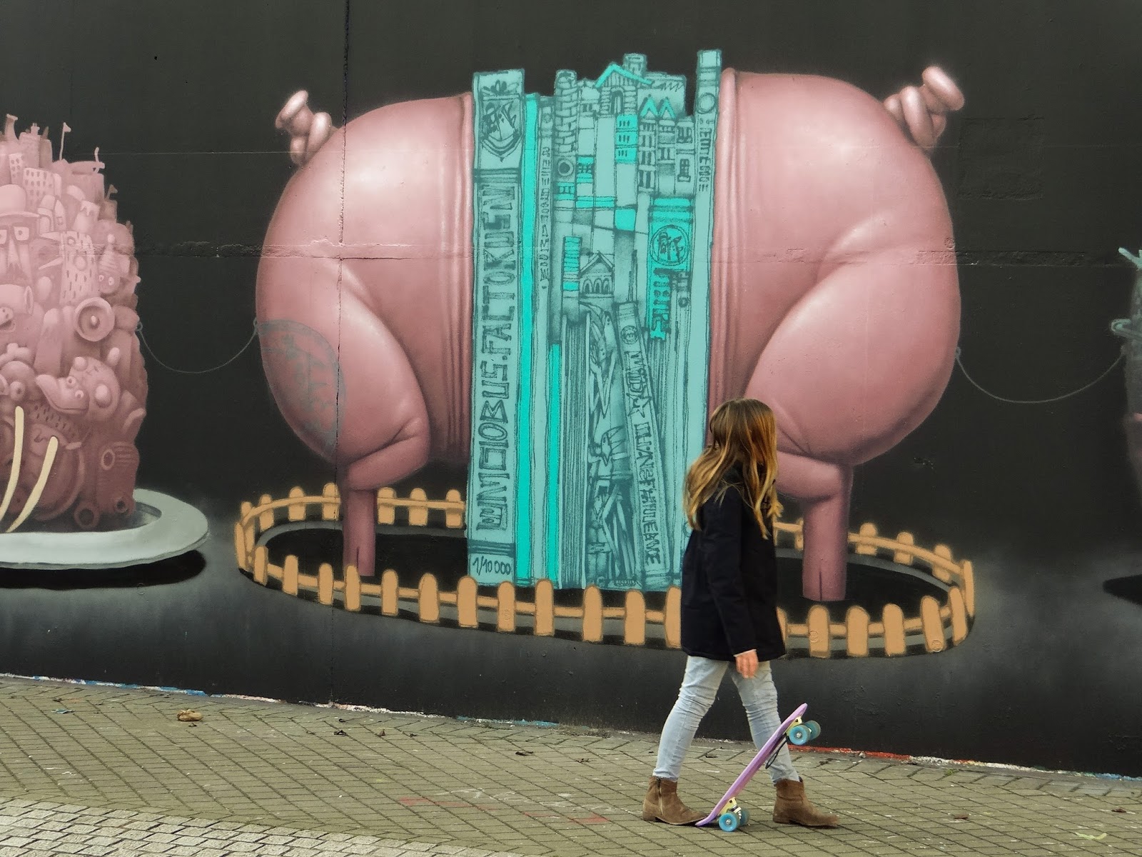 … ‘la queue du cochon , ça fait genre le nœud d’un ballon de baudruche gonflé’ me dit-elle avant d’attraper son skate, passer une fois devant dans un sens , une autre fois dans un autre sens , prendre la pose , me tirer la langue et m’annoncer qu’il y a une très bonne boulangerie dans le coin où elle allait quand elle était à l’école primaire…