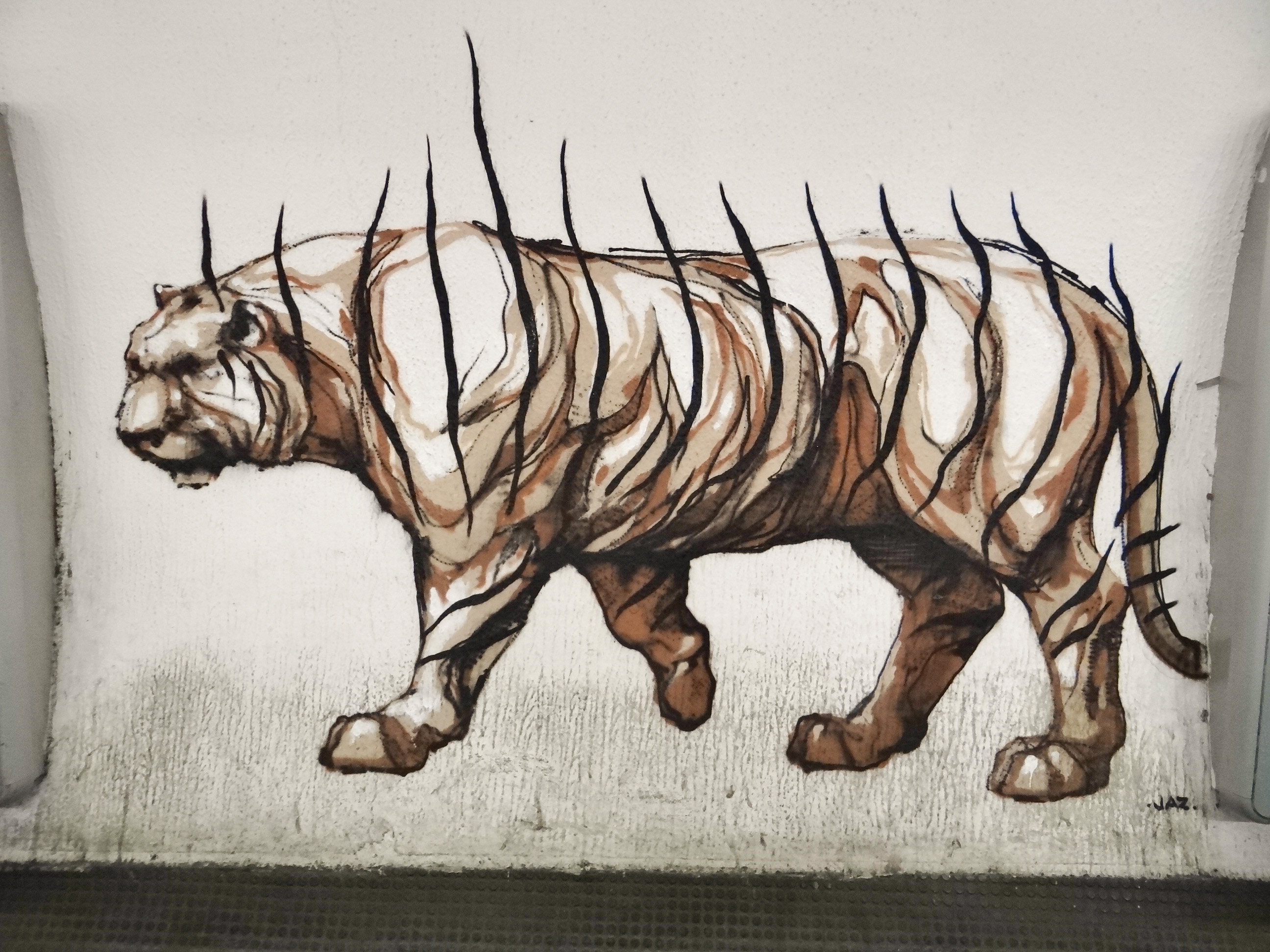 Cette exposition hors norme a été baptisée Urban Legends que l’on peut traduire par Légendes Urbaines en français… et pourtant, on est loin du mythe, on est bien dans la réalité de l’art urbain : 14 oeuvres sur 400 métres carrés auxquelles sont venues s’ajouter par la suite d’autres création, comme celle de Jaz avec son tigre ou Eron et ses panneaux ‘à vendre’ avec en filigrane des portraits.