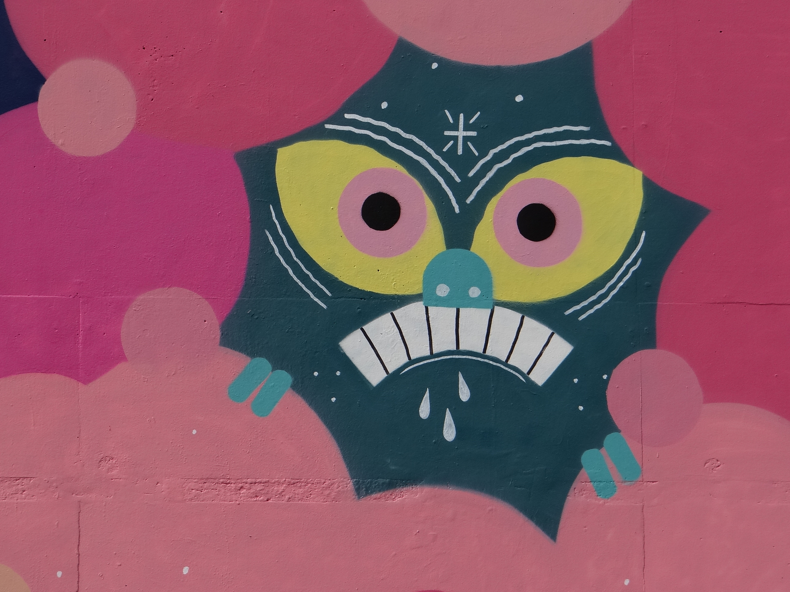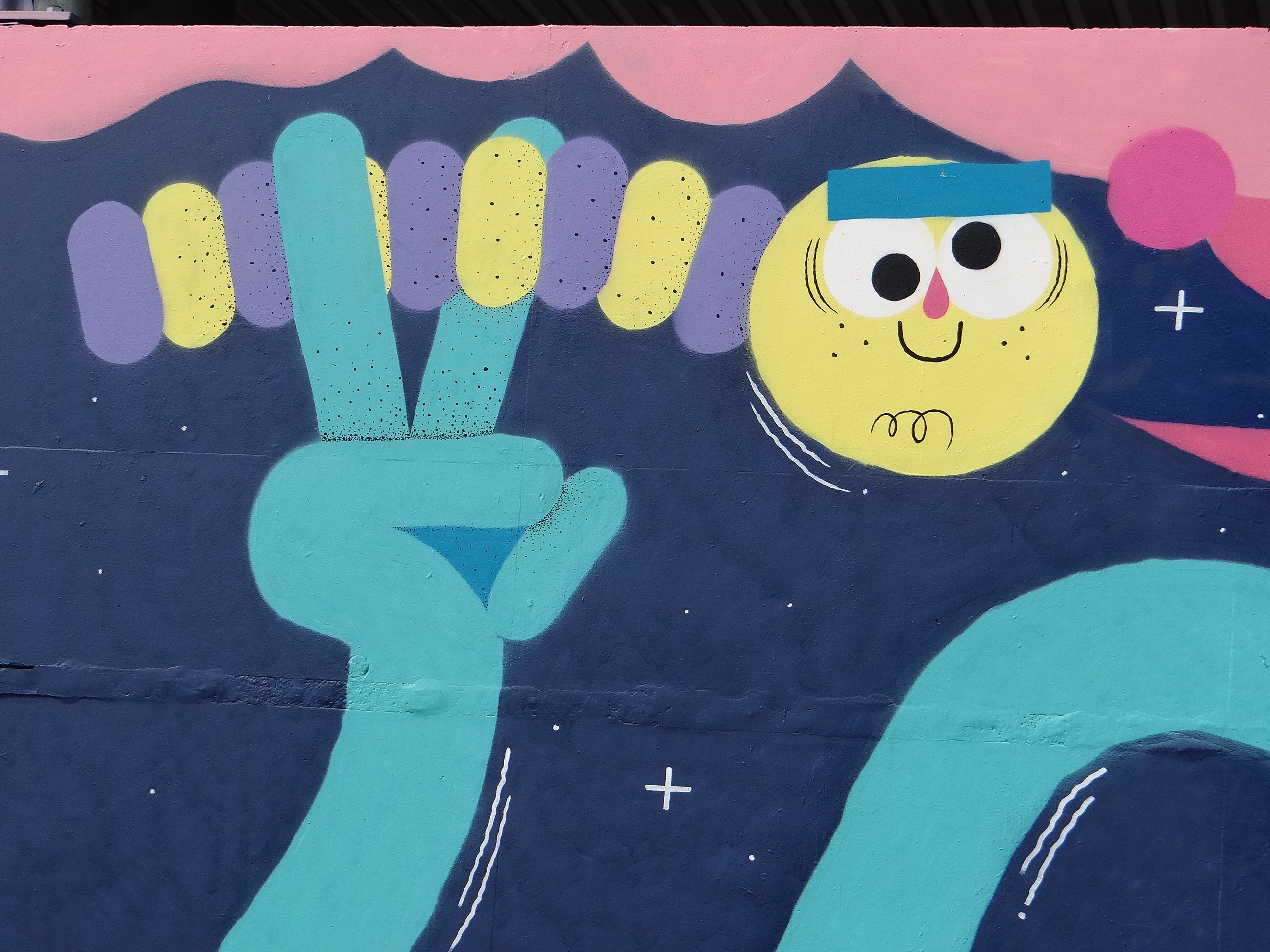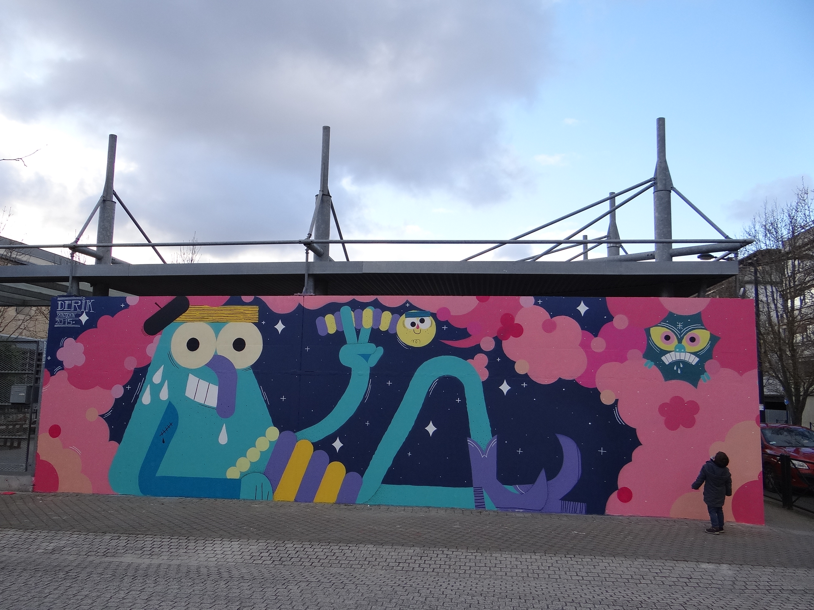 Formes arrondies, physionomie hors norme, netteté des contrastes avec l’utilisation de couleurs vives et saturées, cette fresque a toute sa place sur ce mur adossé à une école primaire.