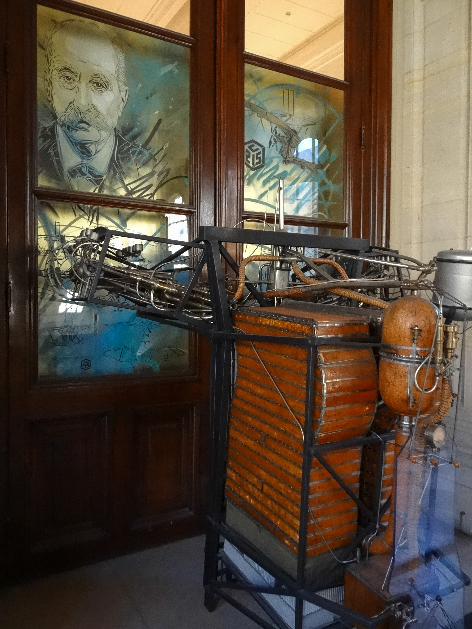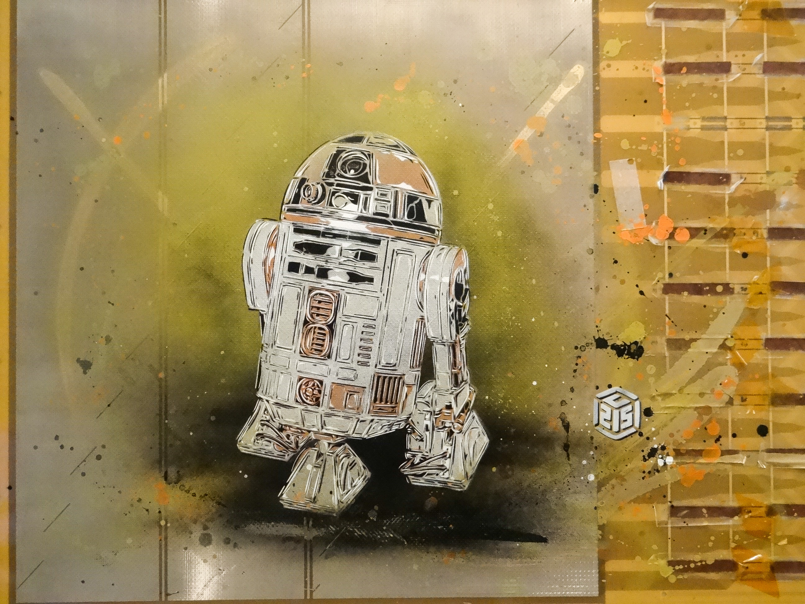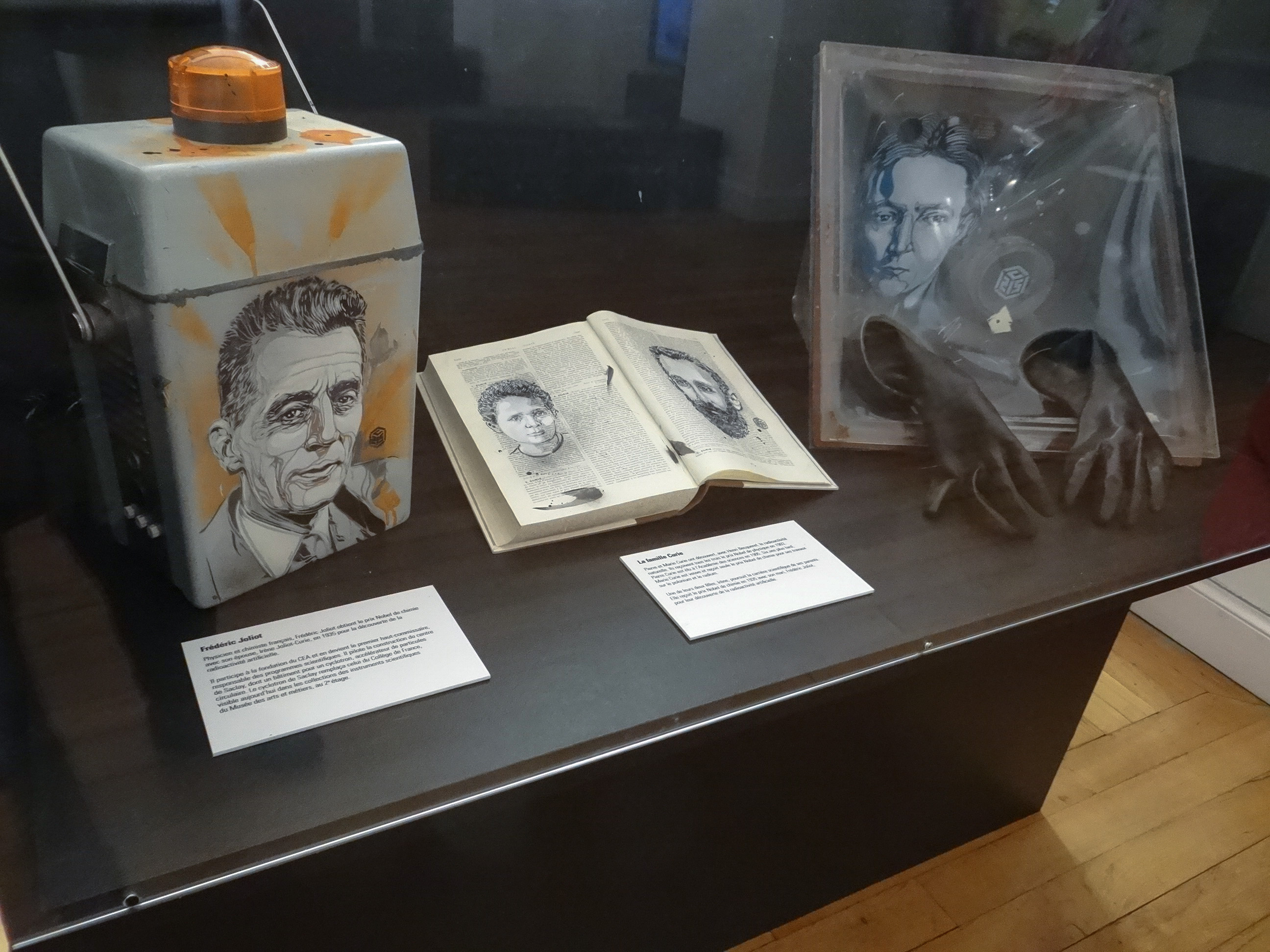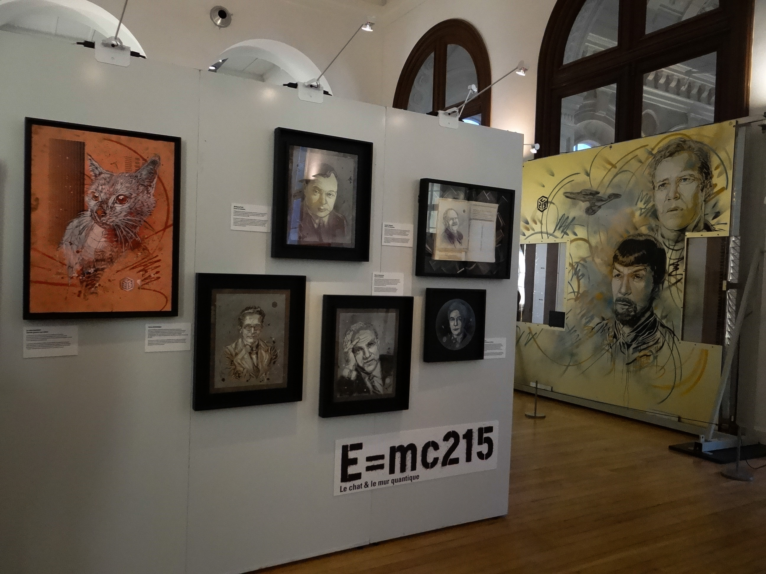 Au final, il en retiendra une quarantaine sur lesquels il essaiera de représenter le portrait d’un scientifique ou d’une personnalité en lien avec l’objet : Marie Curie apparait sur un tableau des éléments chimiques, R2D2 le robot préféré des amoureux de Star Wars sur un circuit électronique et le chat fétiche de C215, que j’aime tant retrouver sur un coin de porte où juste au-dessus d’un boite aux lettre, devient le chat de Schrödinger sur la surface d’un détecteur de particules.
