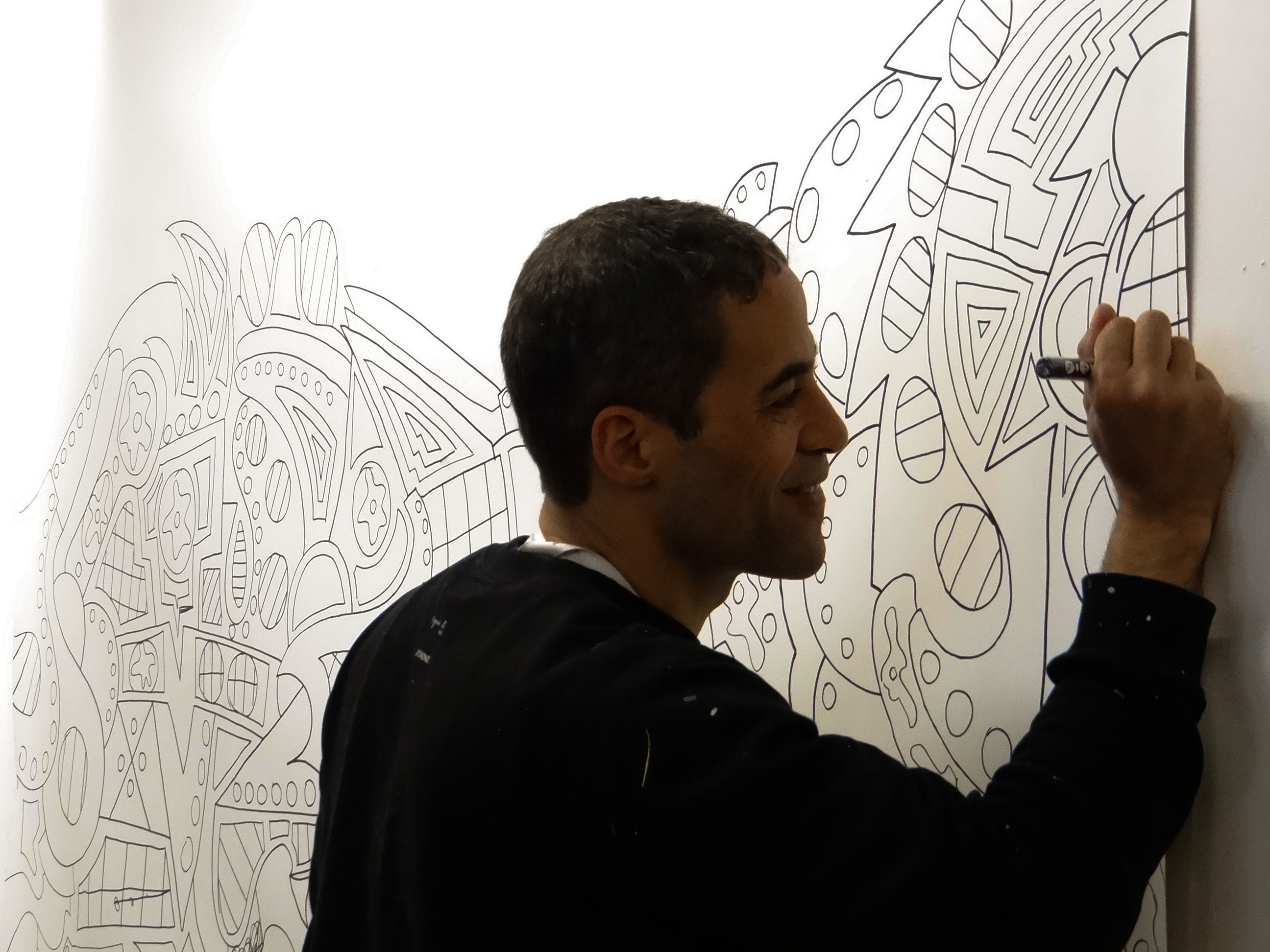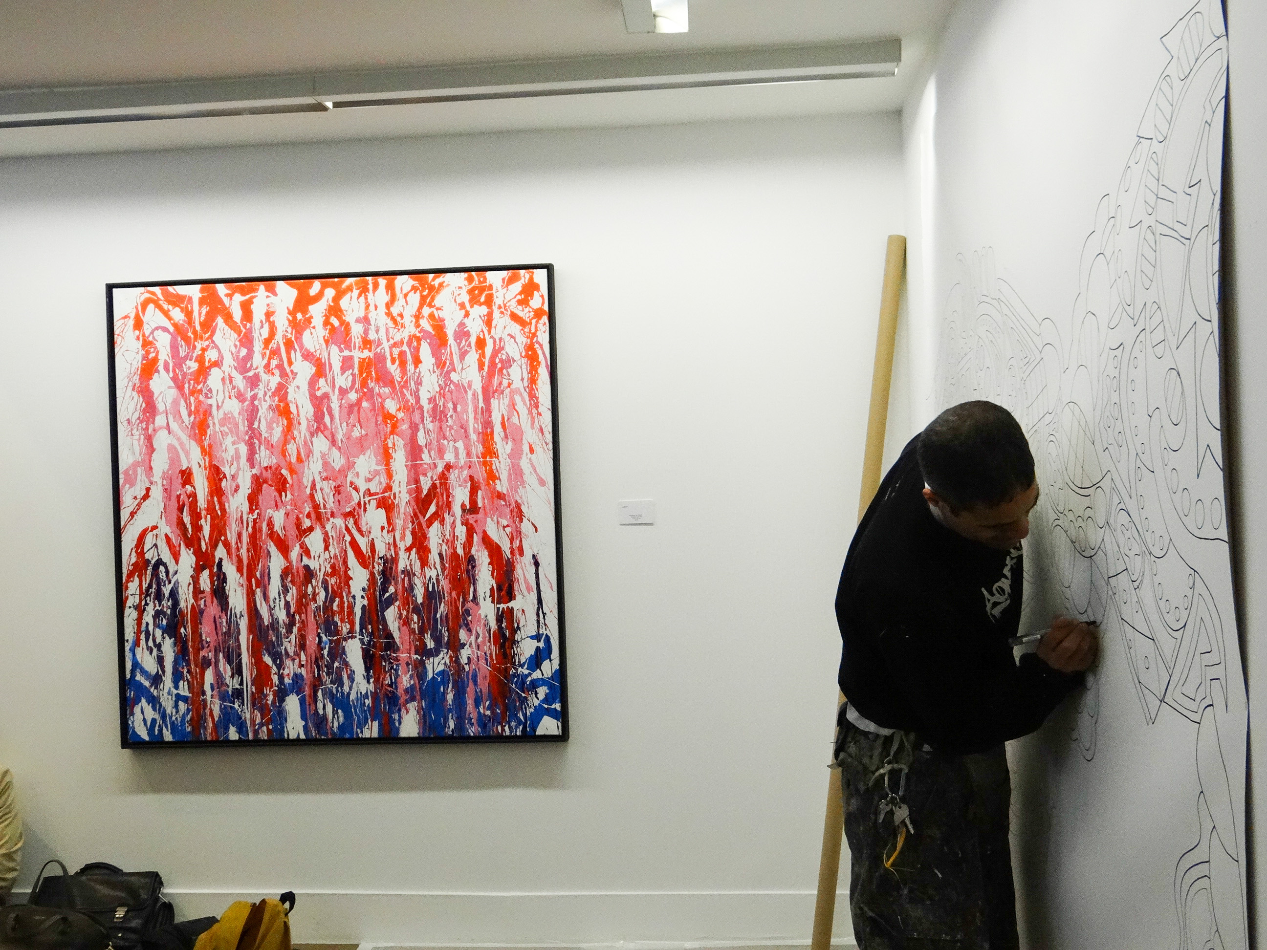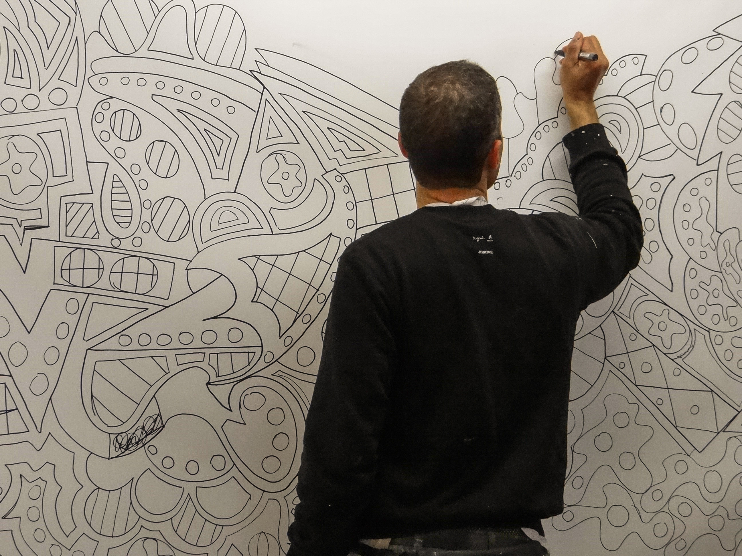 Concentré malgré la foule autour venue le voir créer, JonOne dessine au gros feutre noir des cercles qui s’entrelacent, prend du recul, observe et complète la série de triangles sur le côté.