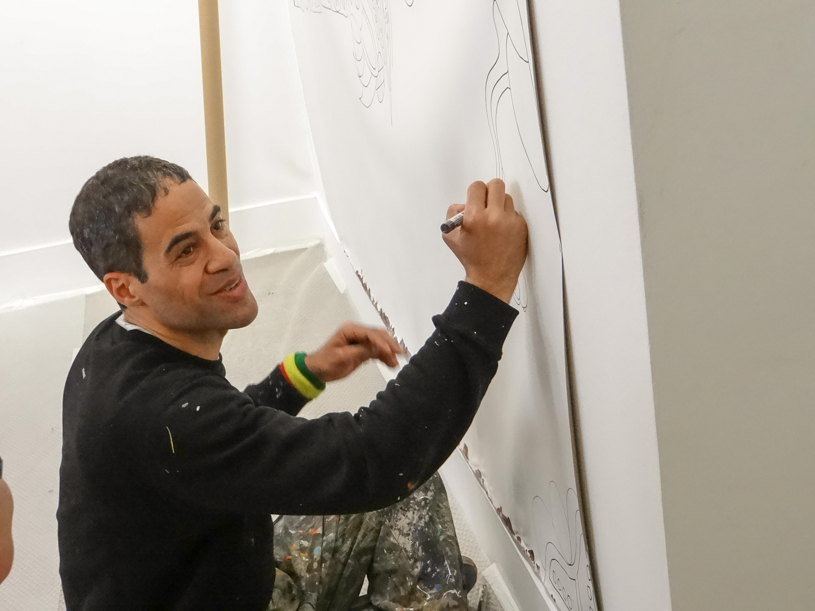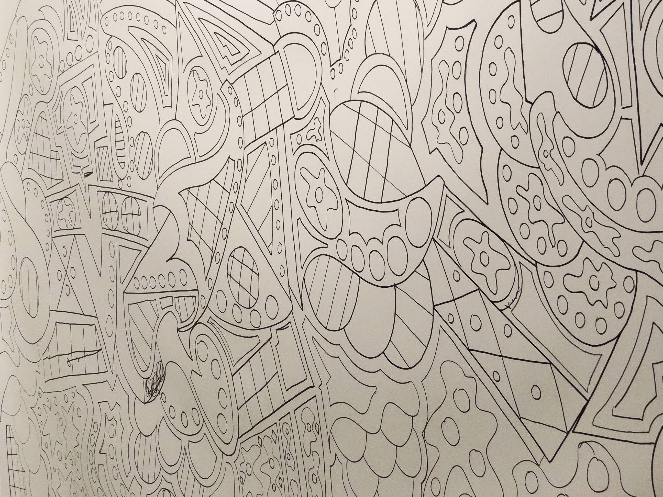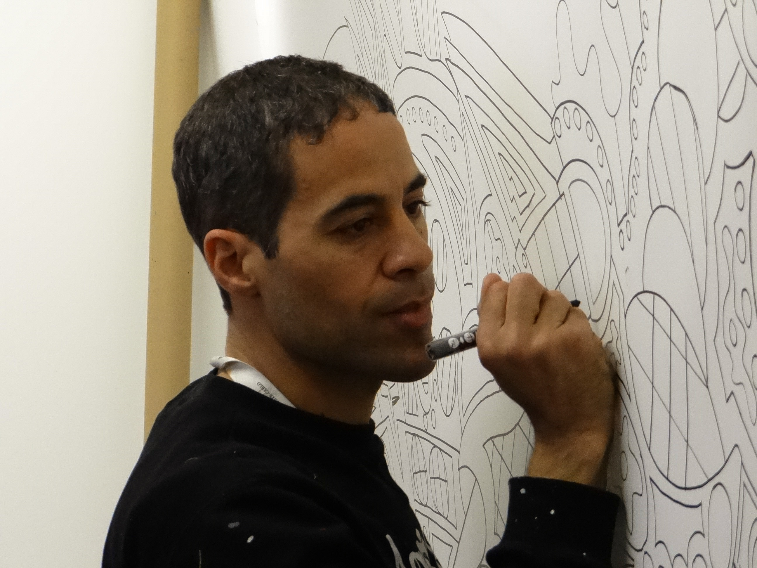 Concentré malgré la foule autour venue le voir créer, JonOne dessine au gros feutre noir des cercles qui s’entrelacent, prend du recul, observe et complète la série de triangles sur le côté.