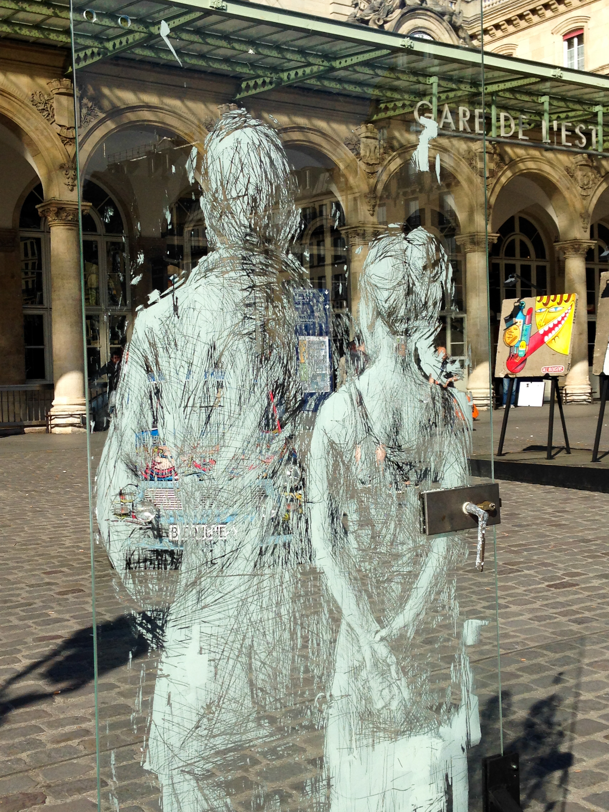 Borondo nous offre un tableau réalisé en glass-scratching sur une porte vitrée : ‘De dos, pour nous obliger à regarder dans la même direction, immolés dans un cadre classique, crayonnés d’énergie.´