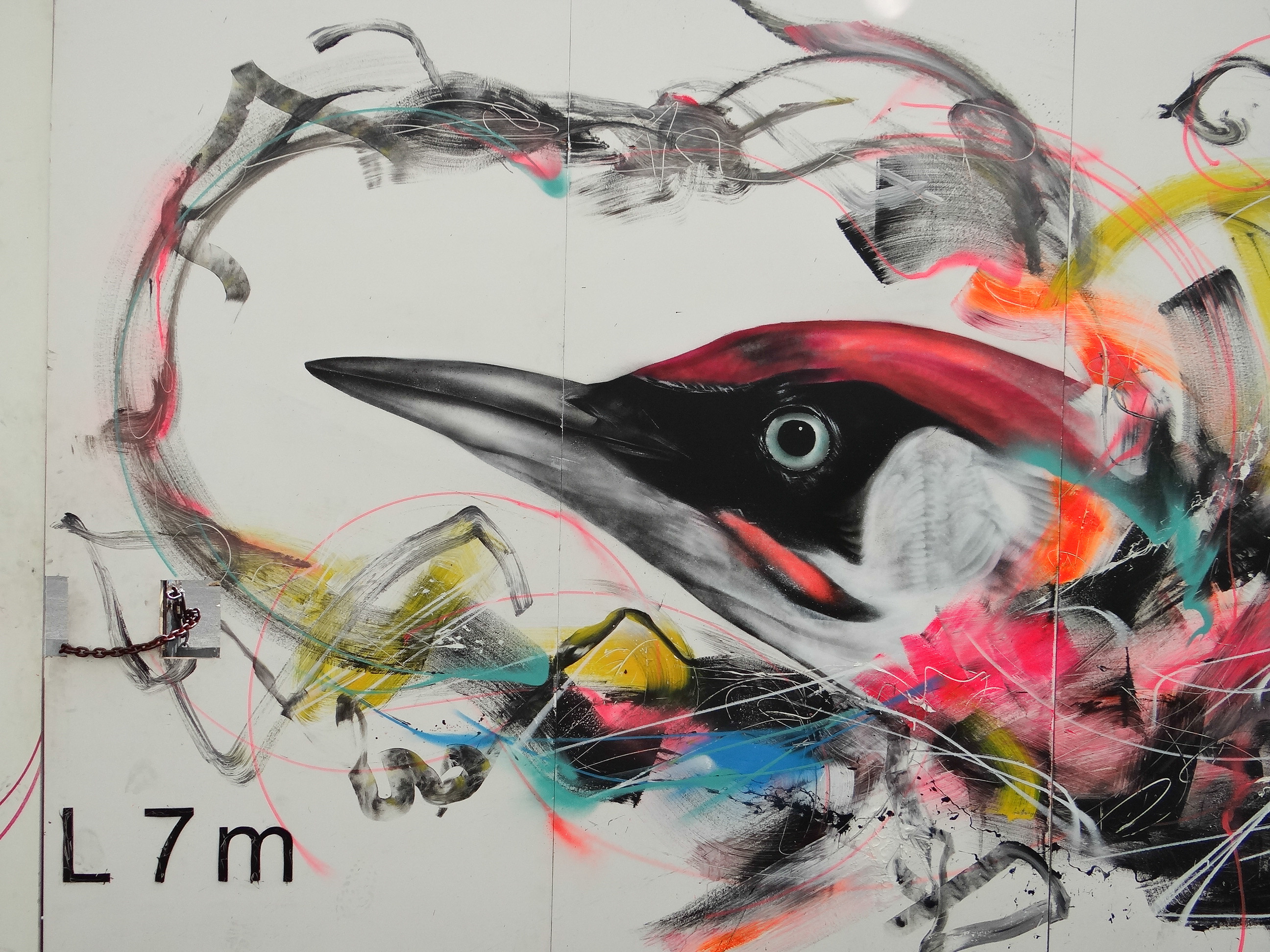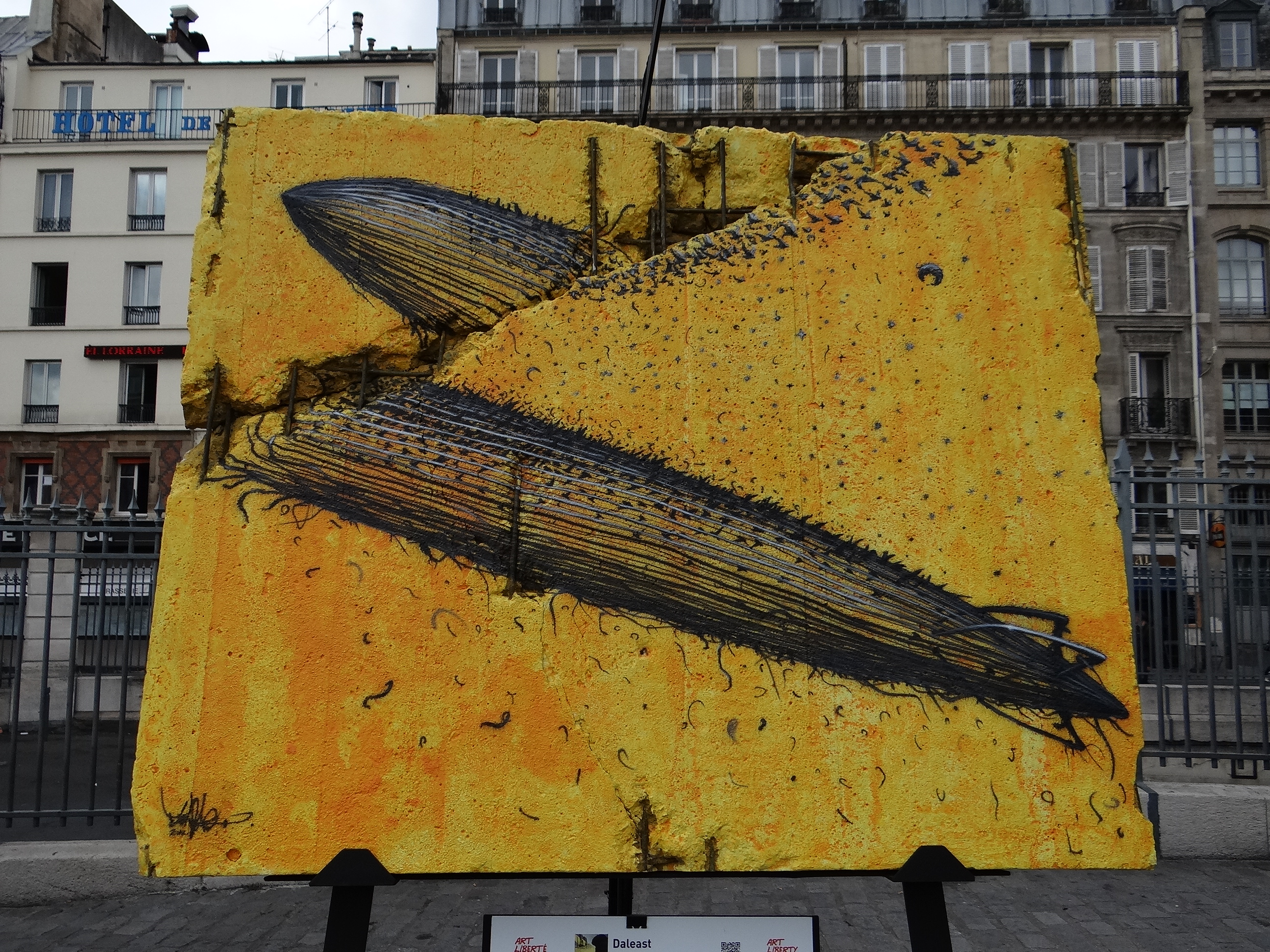 Sur un morceau de mur fracturé, DaLeast représente un zeppelin éventré, d’où s’échappent des oiseaux comme symbole d’une liberté retrouvée.
