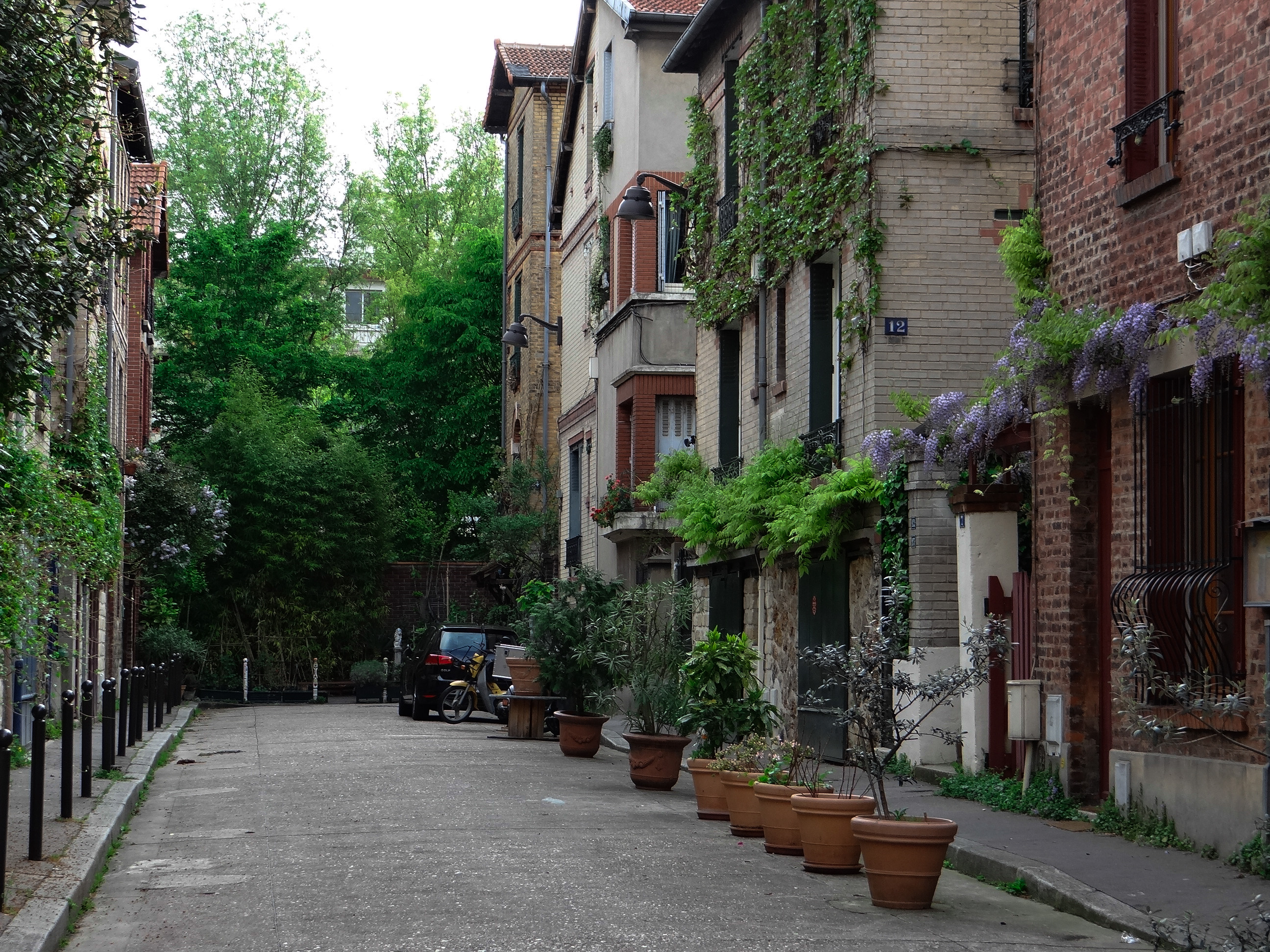 La chaussée recouverte de vieux pavés déglingués entre lesquels des touffes d’herbes apparaissent, est bordée de bâtiments typiques des anciens faubourgs industriels parisiens.