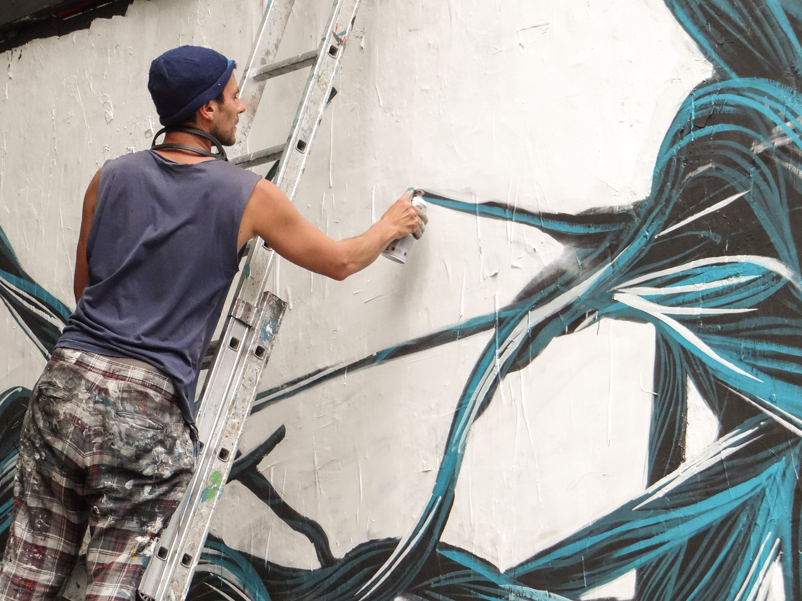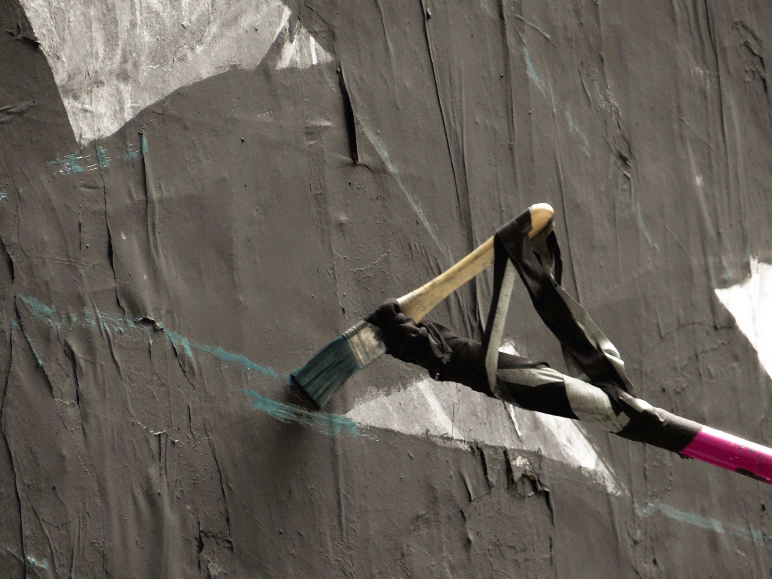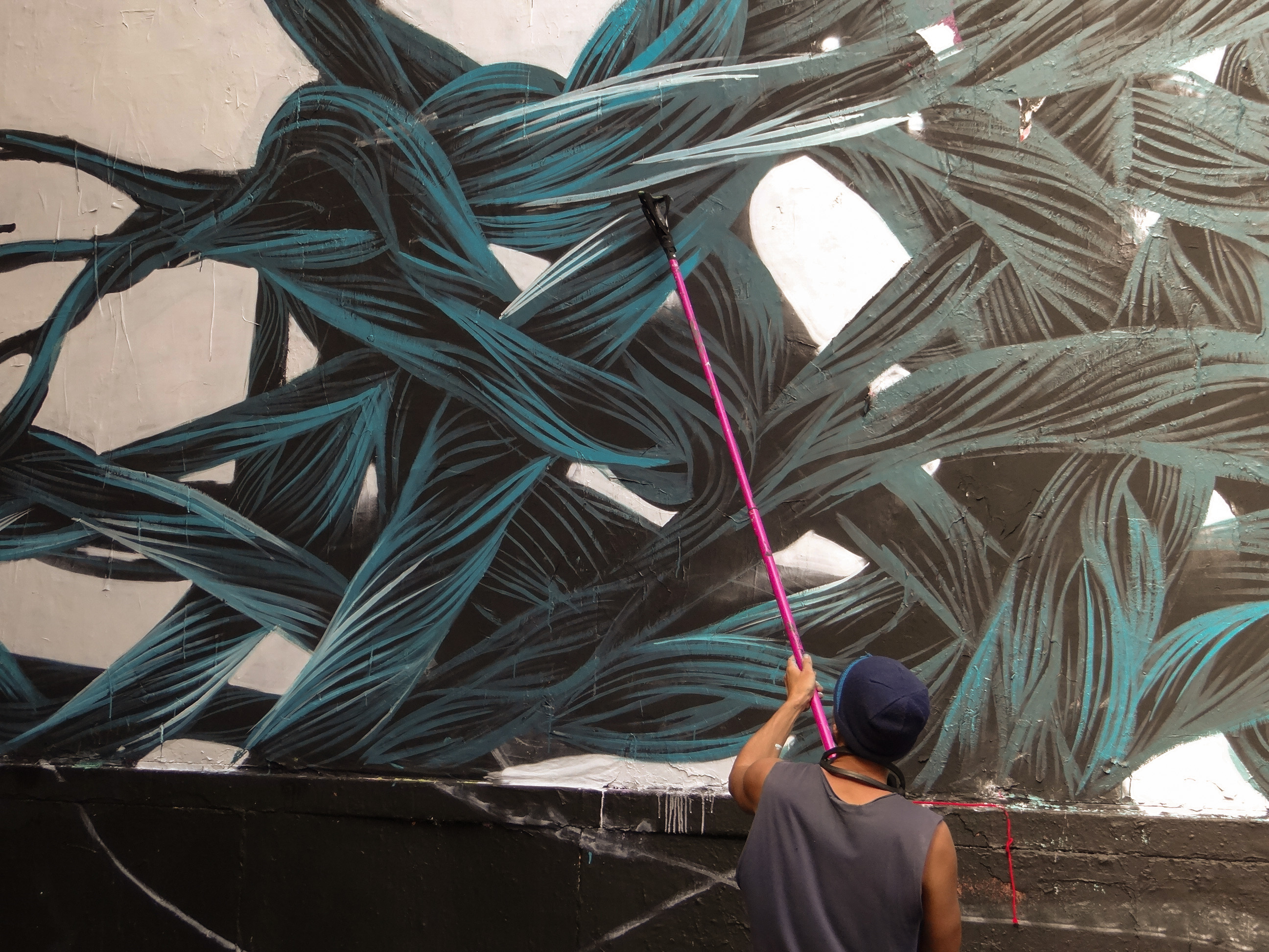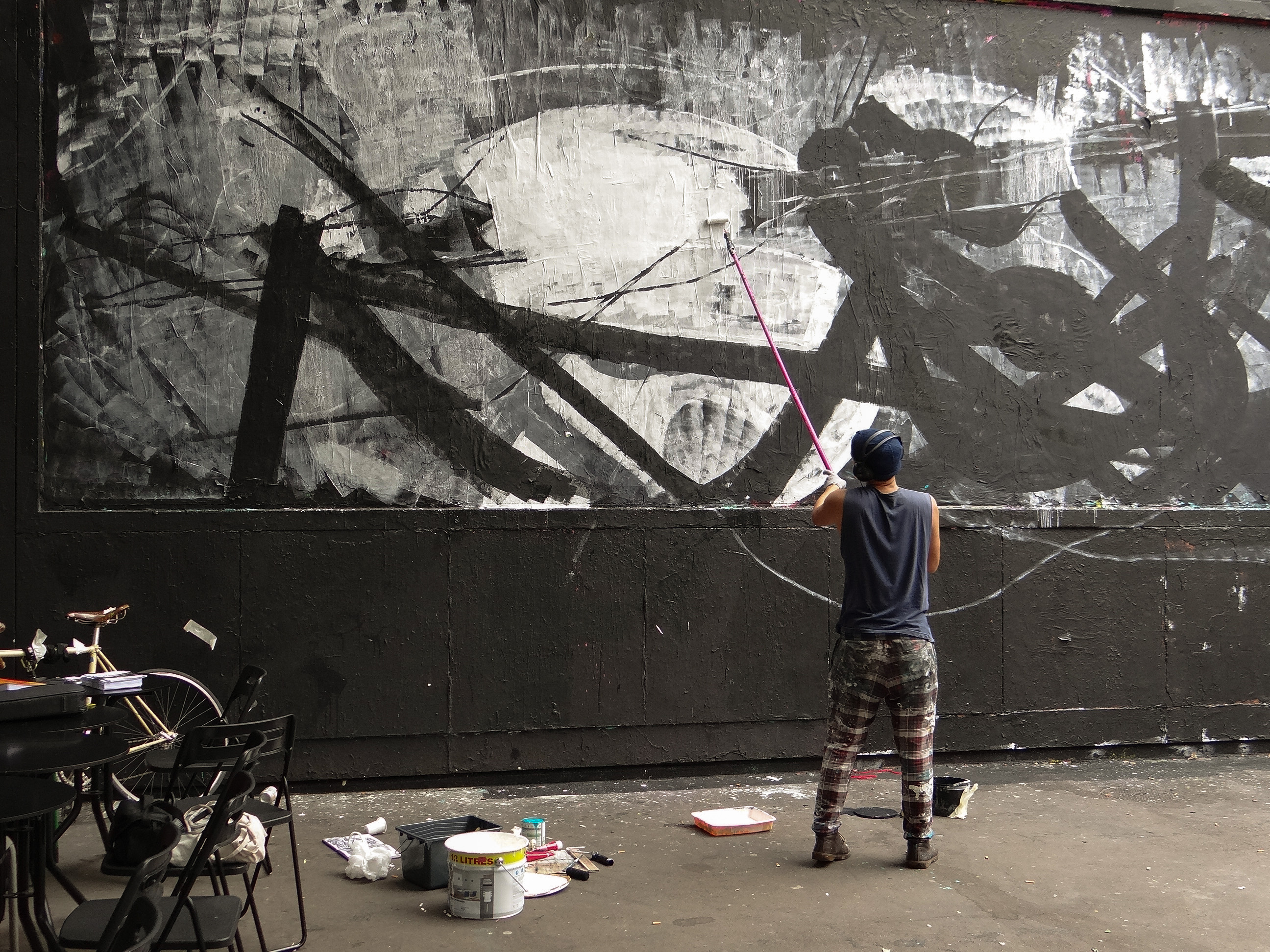 Pour débuter, armé d’une perche à laquelle est fixé un rouleau, il trace les contours en blanc de ce qu’il souhaite représenter.