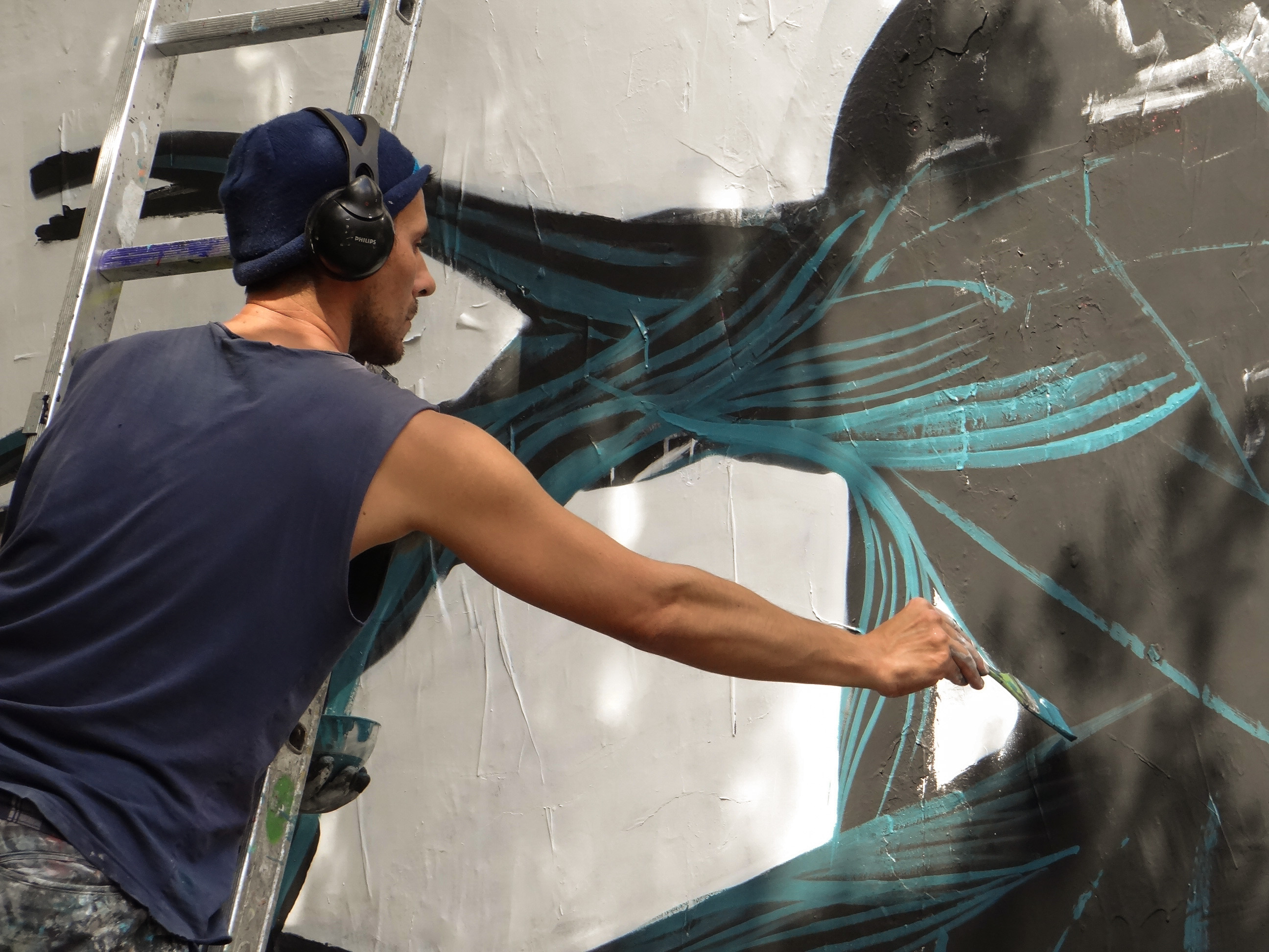 A la perche et au pinceau, il précisera les contours de la corde en bleu et poursuivra ensuite directement au pinceau plat avec une multitude de lignes aux différentes nuances de bleus pour donner du volume.