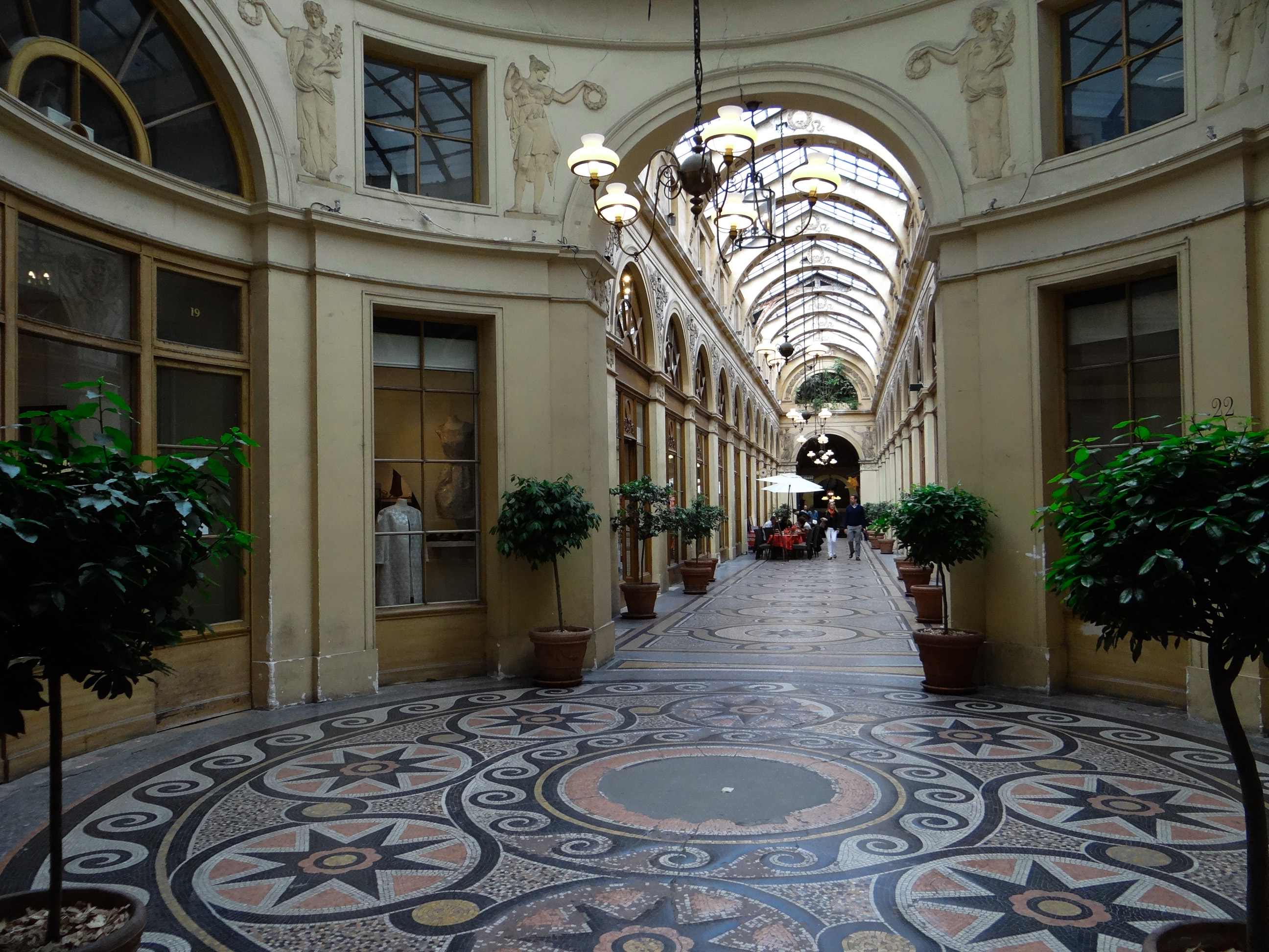 Au lieu des allées et villas du 19eme et des anciennes cours d’artisans du 11eme arrondissement, j’aurais pu aussi commencer la promenade au fil des passages parisiens par des allées plus prestigieuses, plus brillantes, celles ou les collectionneurs de livres ou de cartes postales se sont implantés, où sont proposés des haltes gastronomiques et où de belles mosaïques ornent les sols.