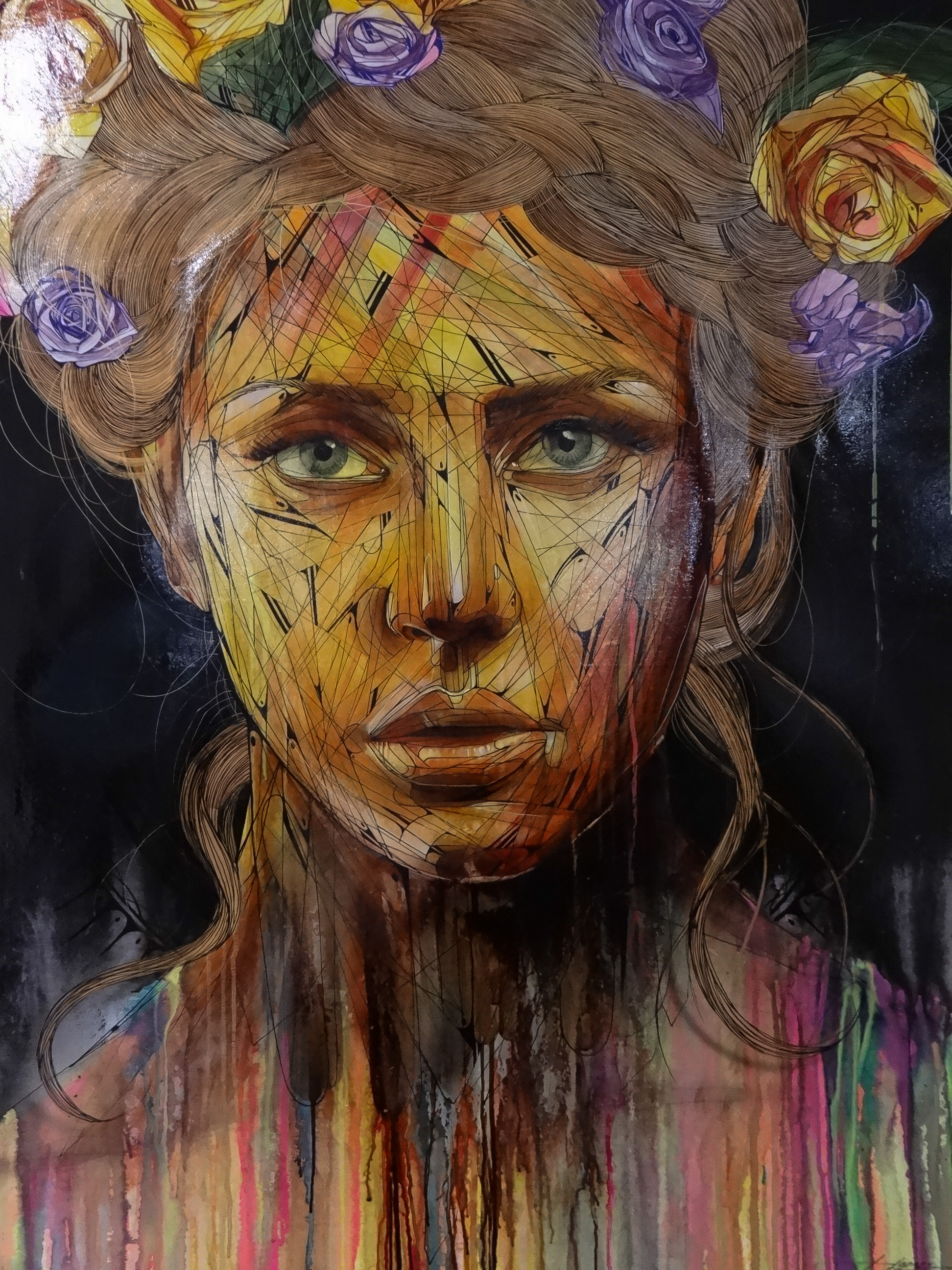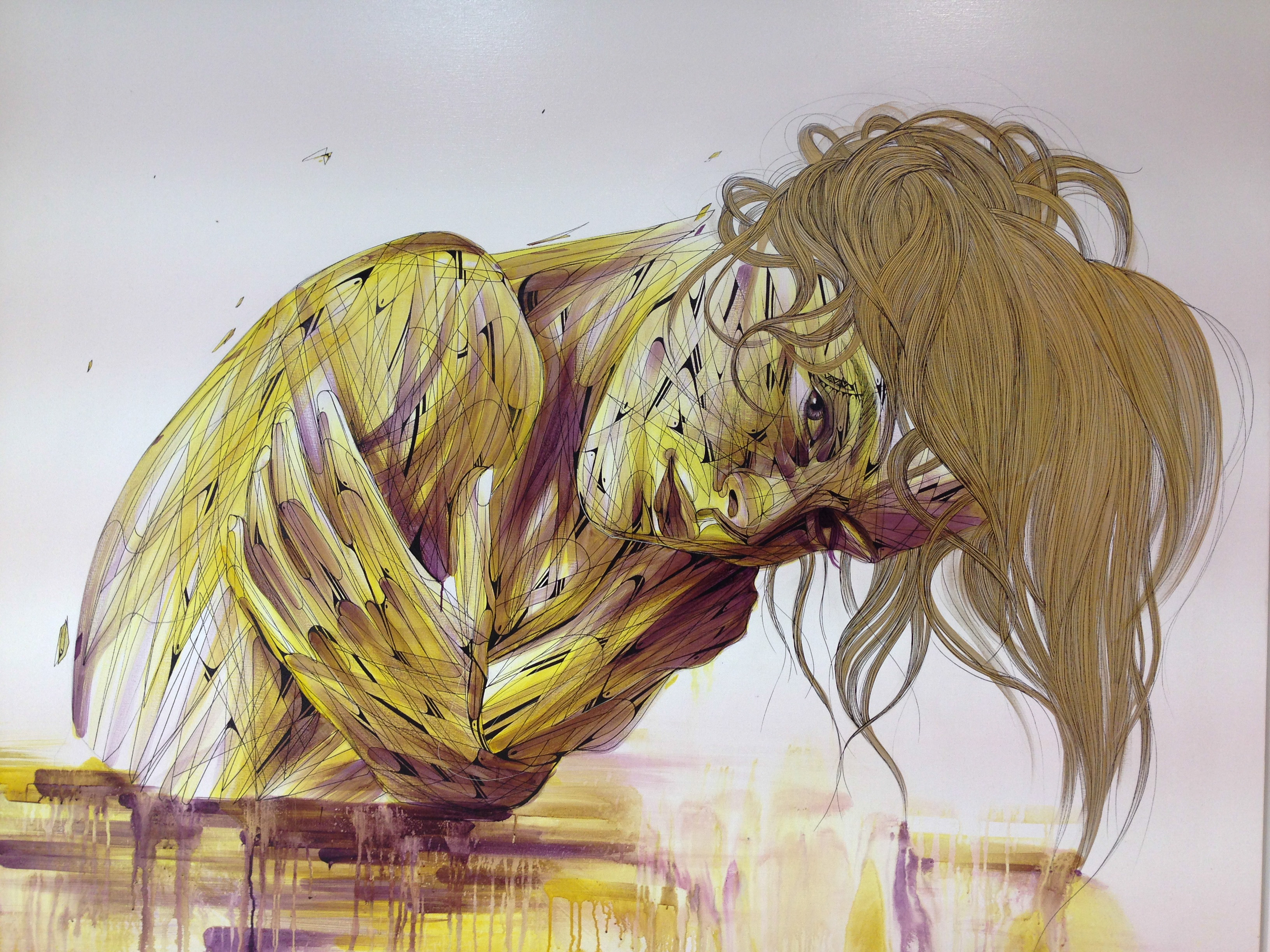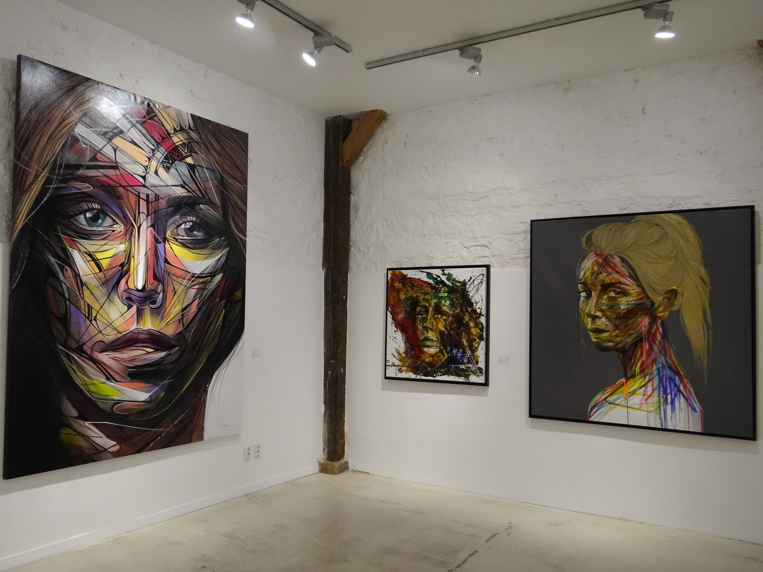 Hopare dit être à la recherche du trait parfait et c’est exactement ce que l’on ressent quand on regarde une de ses toiles : les lanières de couleurs, rehaussées de lignes noires, s’entrelacent pour donner vie à des corps et des visages.