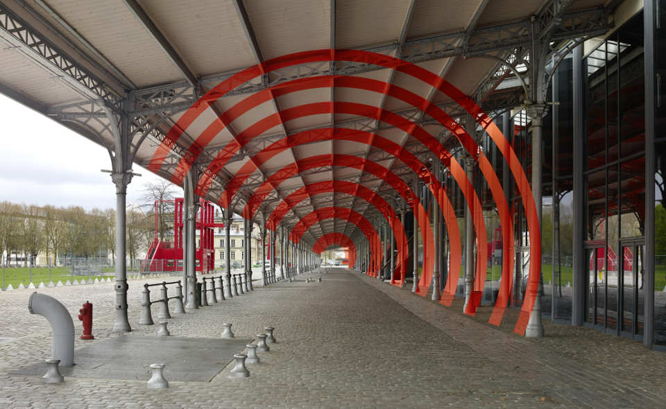 Invité par le Parc de la Villette à réaliser des créations in situ au Pavillon Paul Delouvrier et à la Grande Halle, Felice Varini a investi les lieux en jouant avec les formes et les lumières et a réussi à conférer à cet espace une nouvelle perspective.