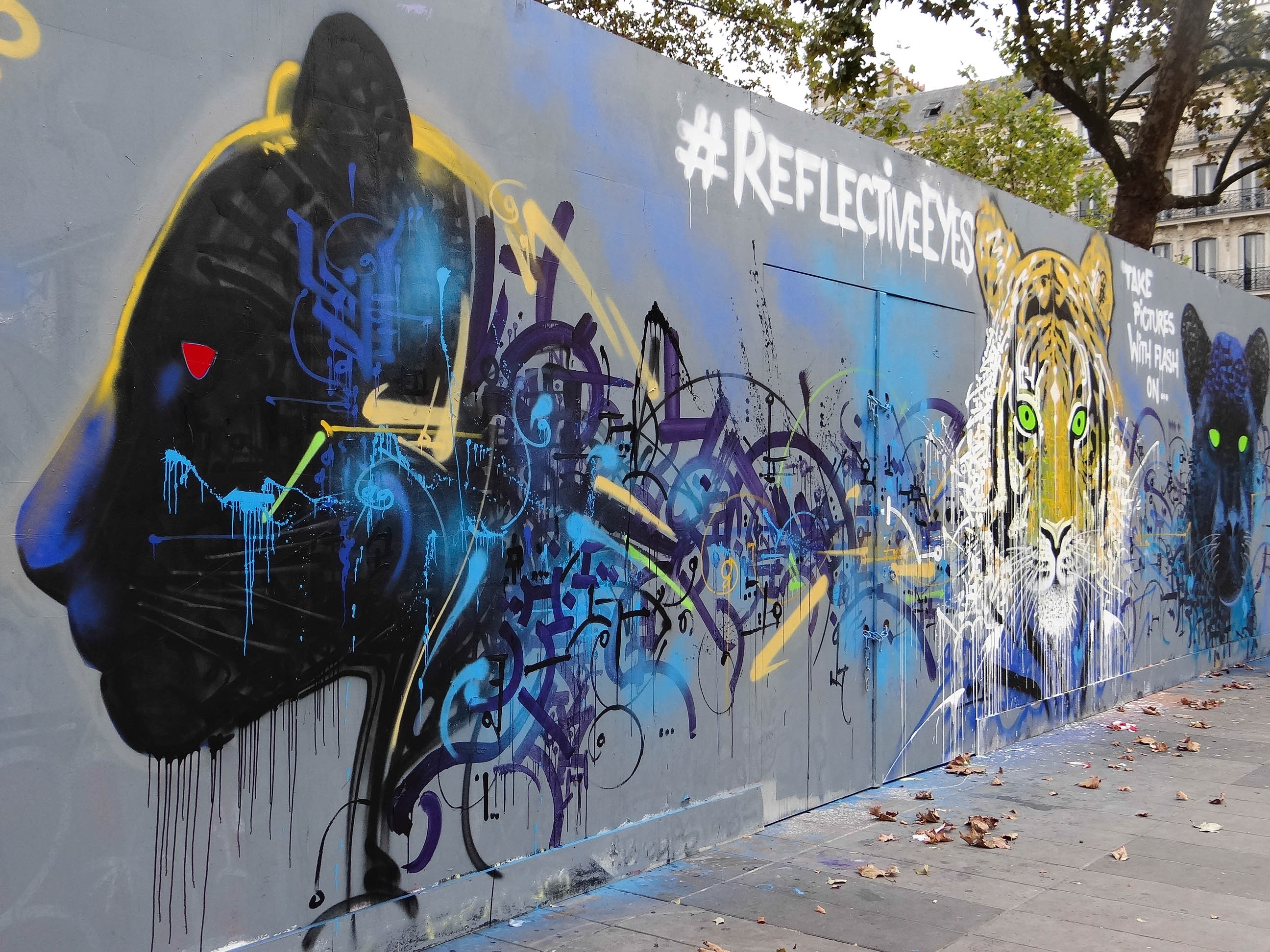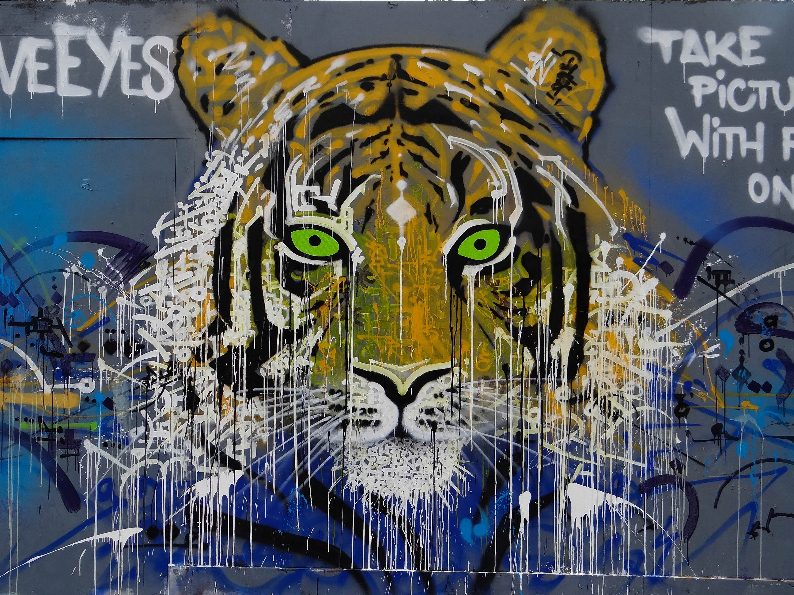 Continuant à utiliser la calligraphie mais cette fois ci sur un immense mur, à coups de superpositions des caractères, coulures et grâce l’utilisation subtile des couleurs, Marko93 a donné vie et volume à 3 superbes félins.